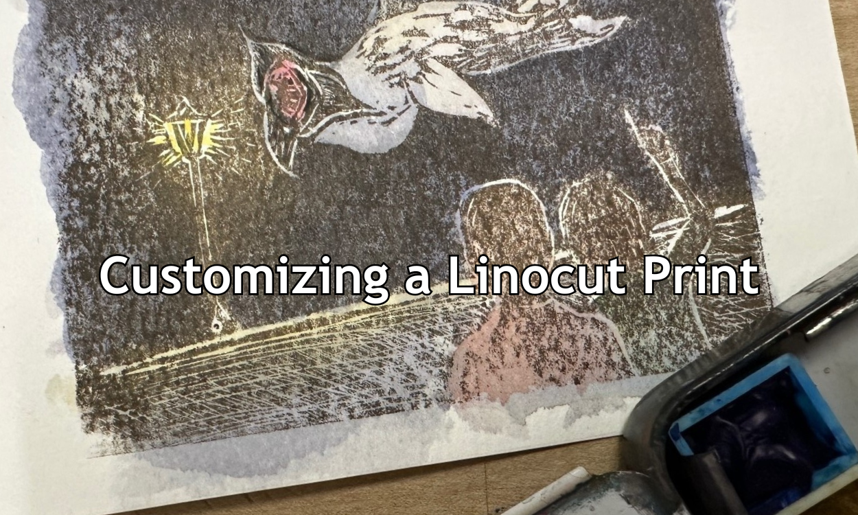 Now that I had my prints, it was time to play with color! In order to retain the printmaking quality of linocut that I was seeking, I needed to use art media that have transparent qualities to them. I selected a few choices and started experimenting.