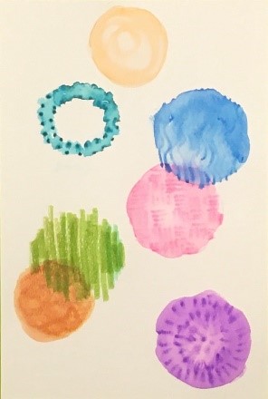 - Exploration of mark making with water painted over marker, producing a watercolor-like effect.