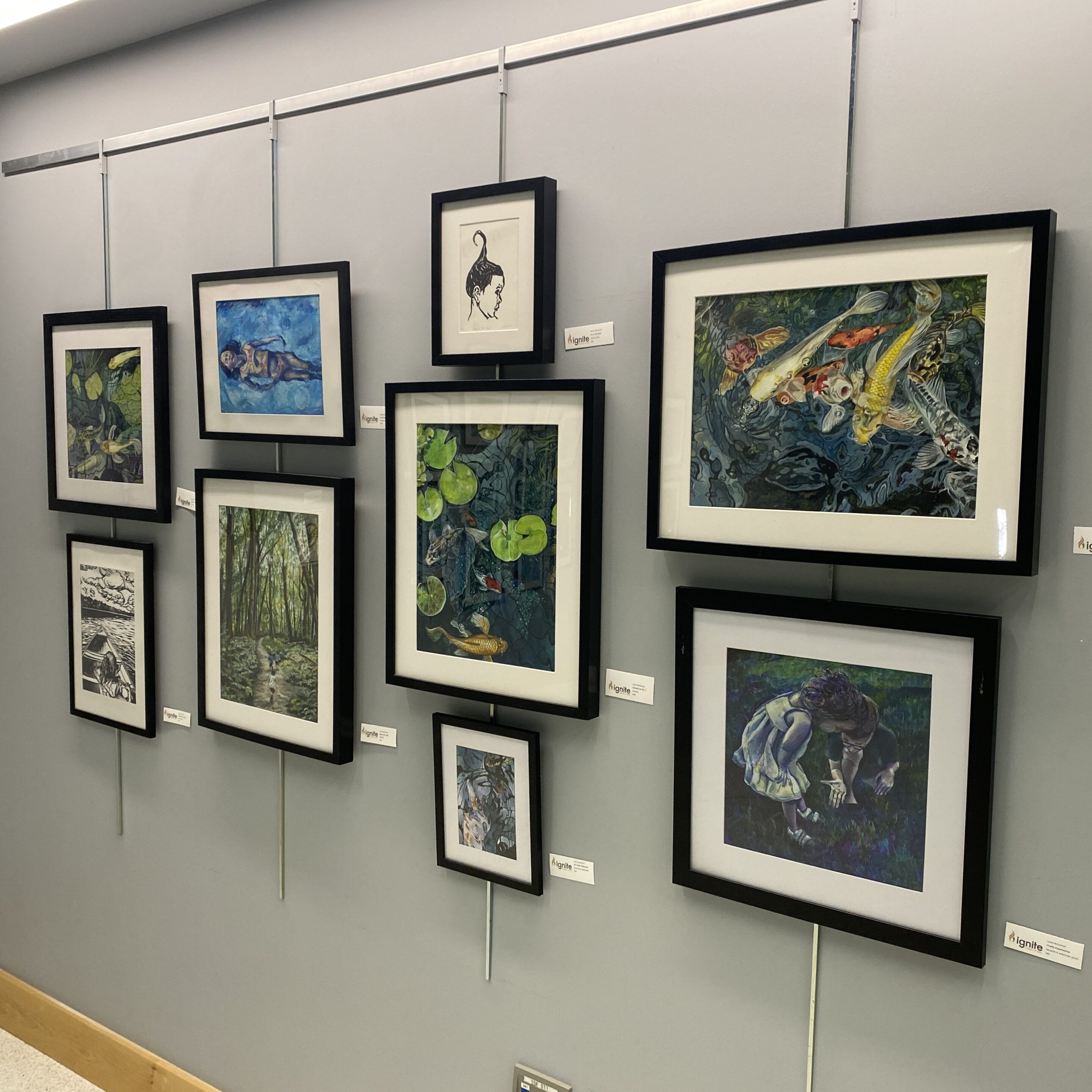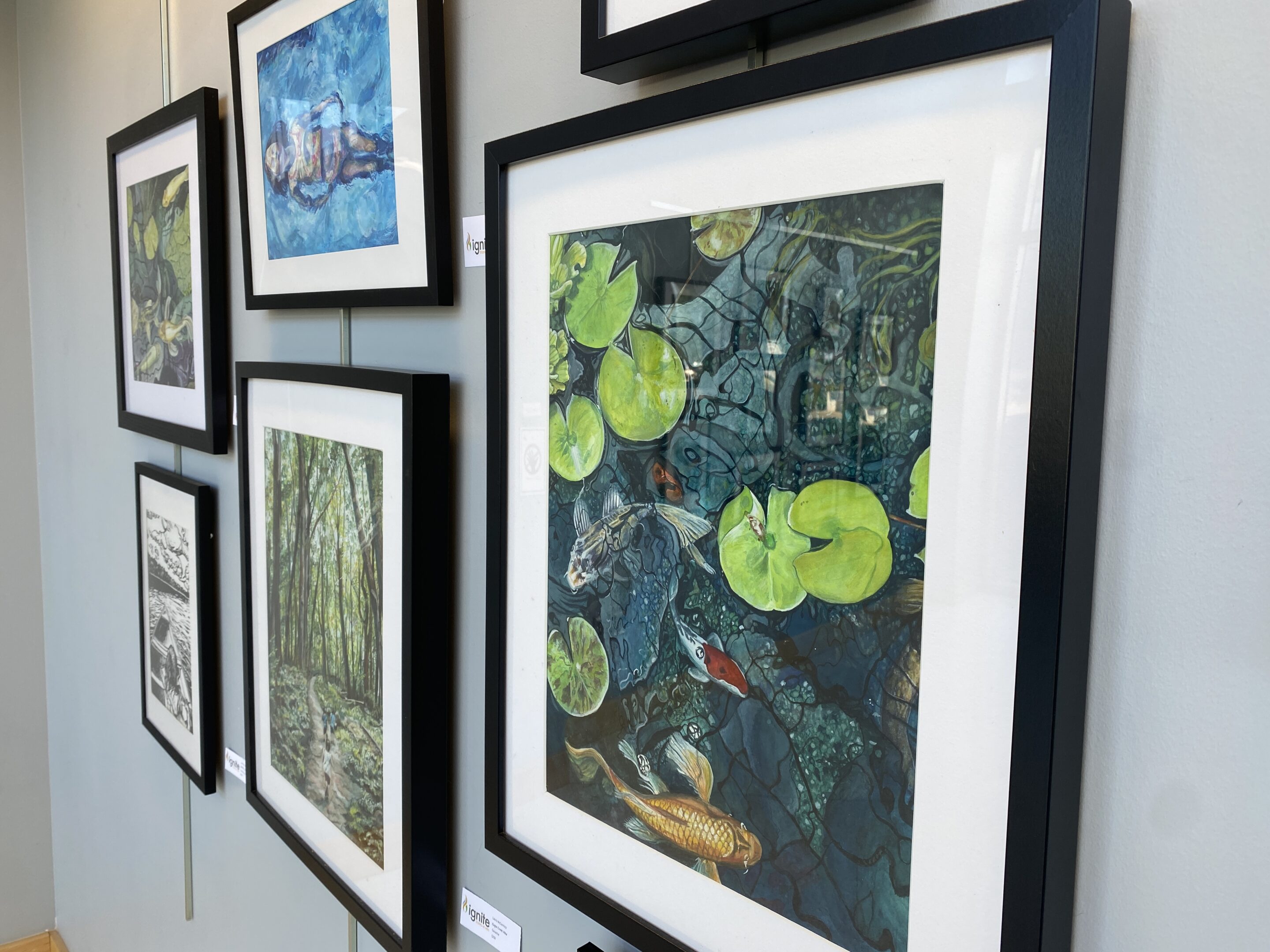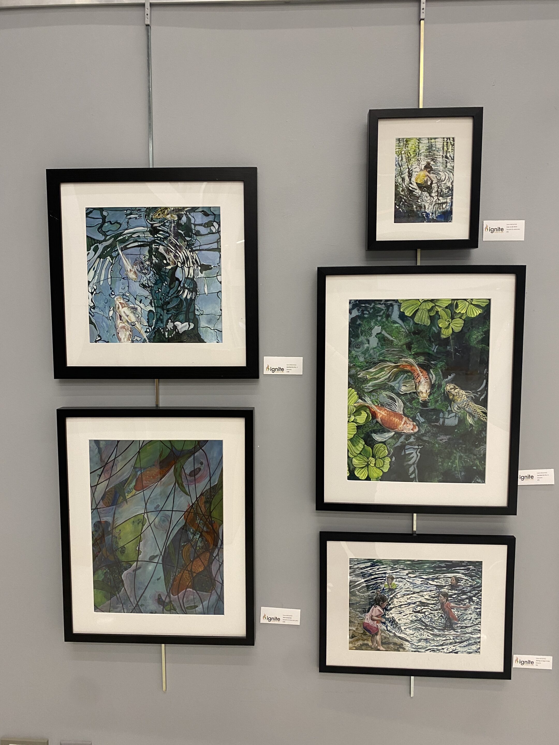 “Reflected Moments” is a body of work that explores how fleeting experiences can be preserved through the creative process. It refers to both literal reflections on water and to the act of reflecting on memory and experience. Laura’s paintings often begin with simple observations: the play of light across water, the dart of koi beneath a surface, or a moment of stillness with family at home.
